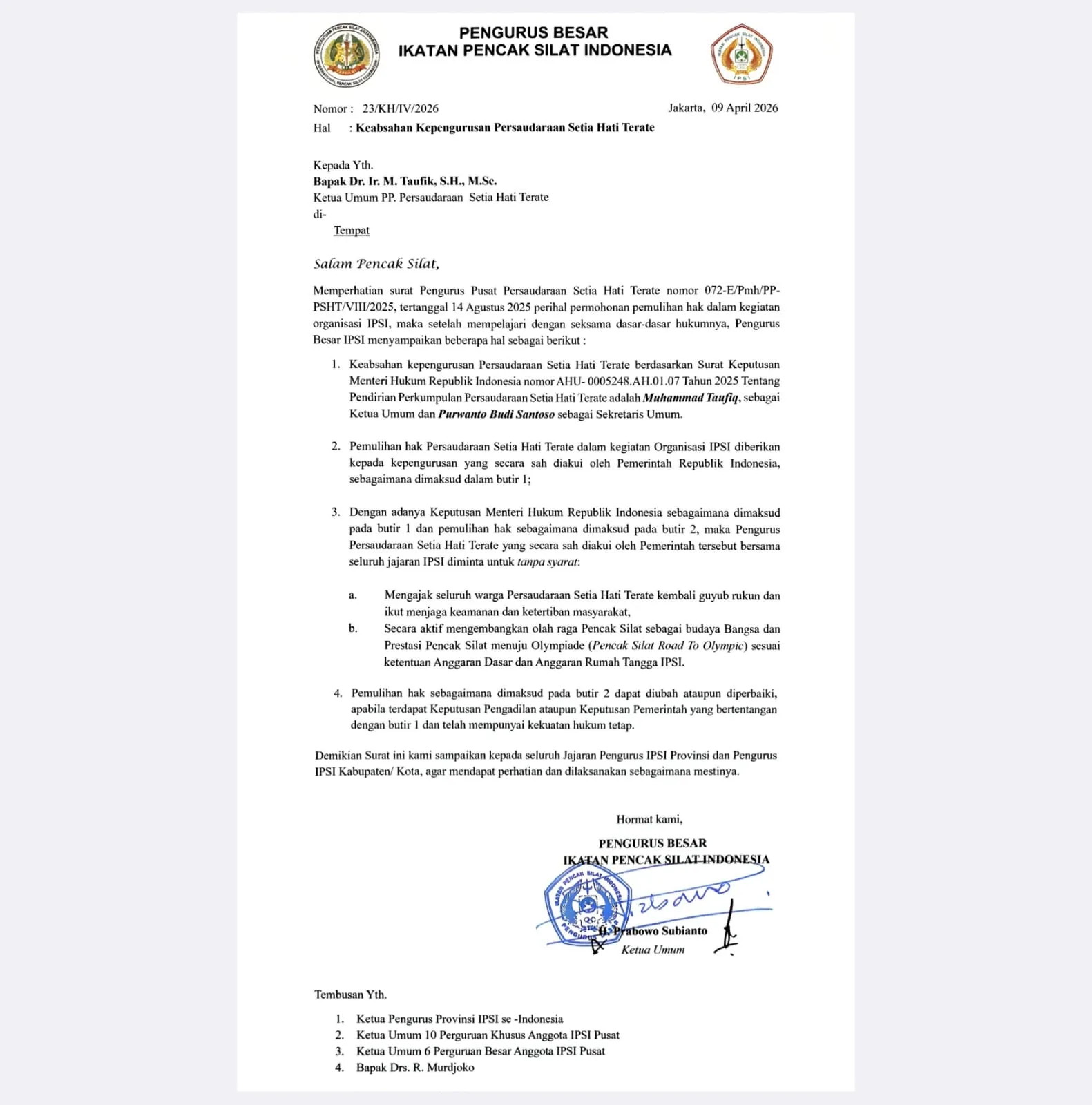 Kepemimpinan Dr. Ir. Muhammad Taufiq, S.H., M.Sc. di tubuh Persaudaraan Setia Hati Terate (PSHT) resmi memperoleh pengakuan dari Pengurus Besar Ikatan Pencak Silat Indonesia (PB IPSI).